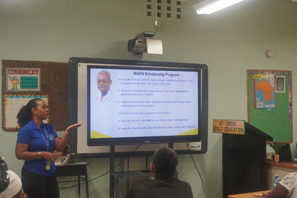 On January 15, 2026, WAPA’s Human Resources and Communications teams visited the St. Croix Adult Education School, where they met with 15 adult learners to share information on the scholarship application process, eligibility requirements, and workforce opportunities.